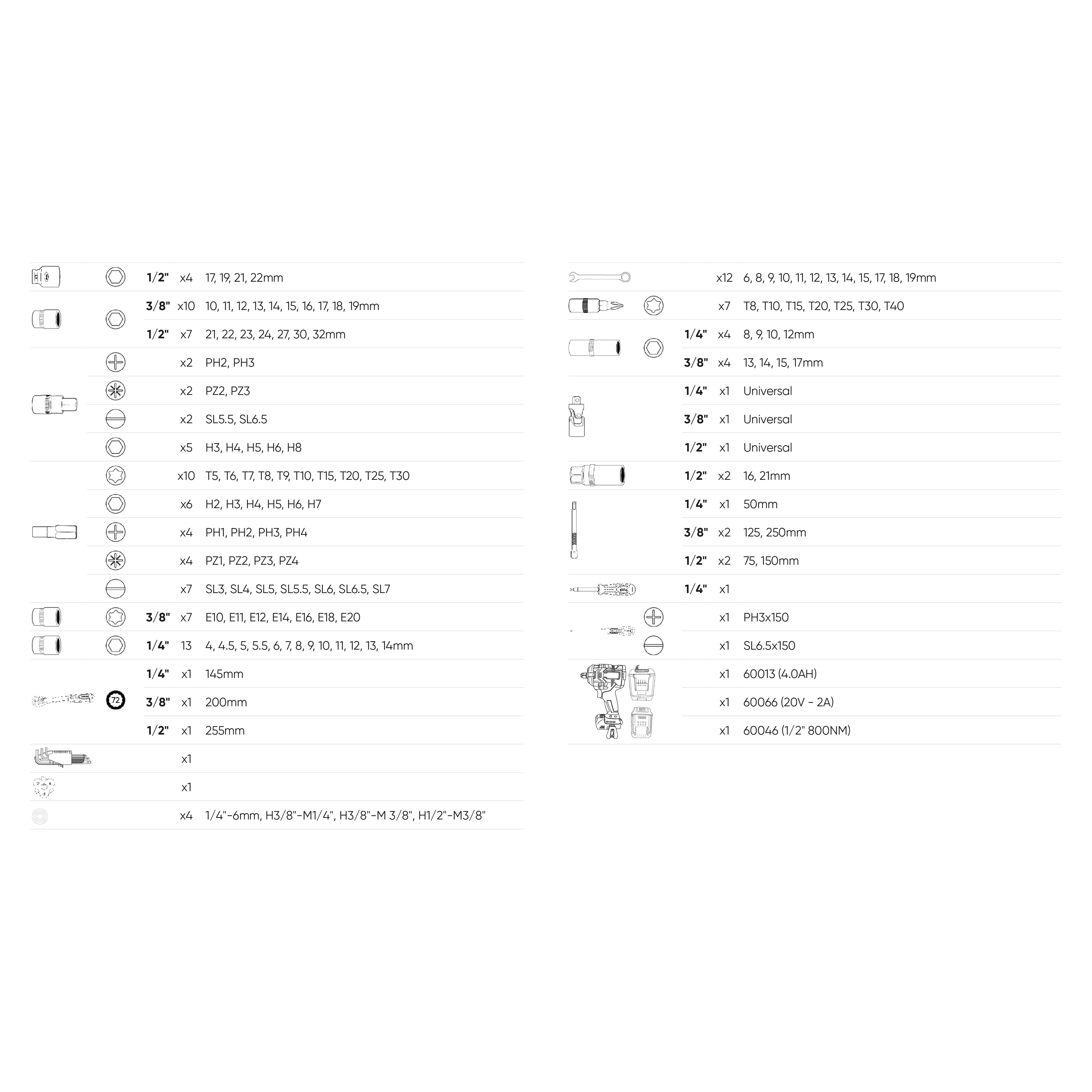 · 3/8": E10, E11, E12, E14, E16, E18, E20